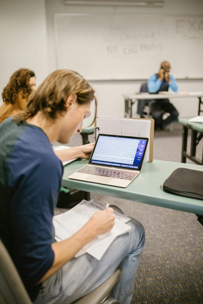 Focused young female student in warm hoodie and blue headsets reading notes in copybook while sitting on wooden table and doing homework in bright cozy kitchen